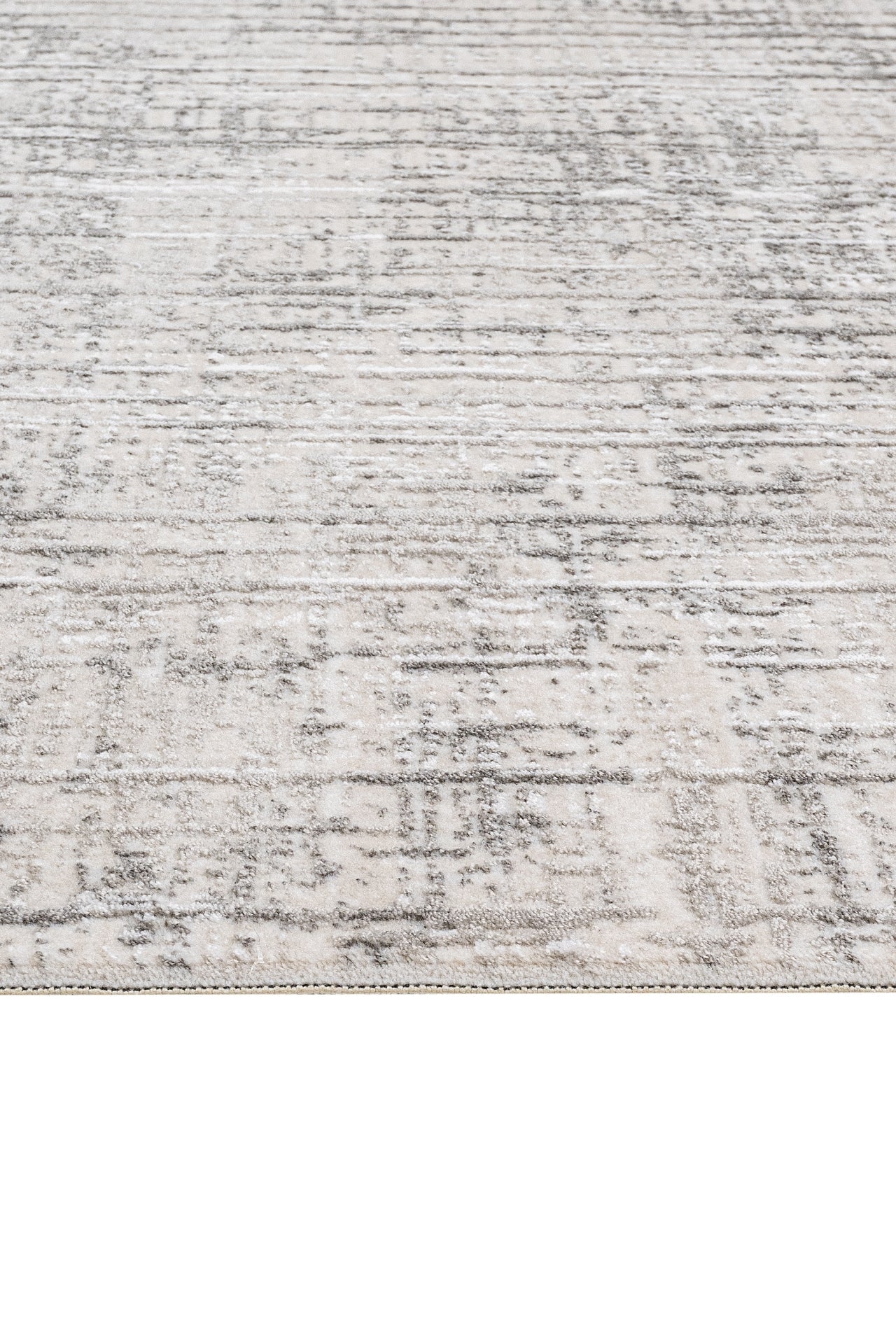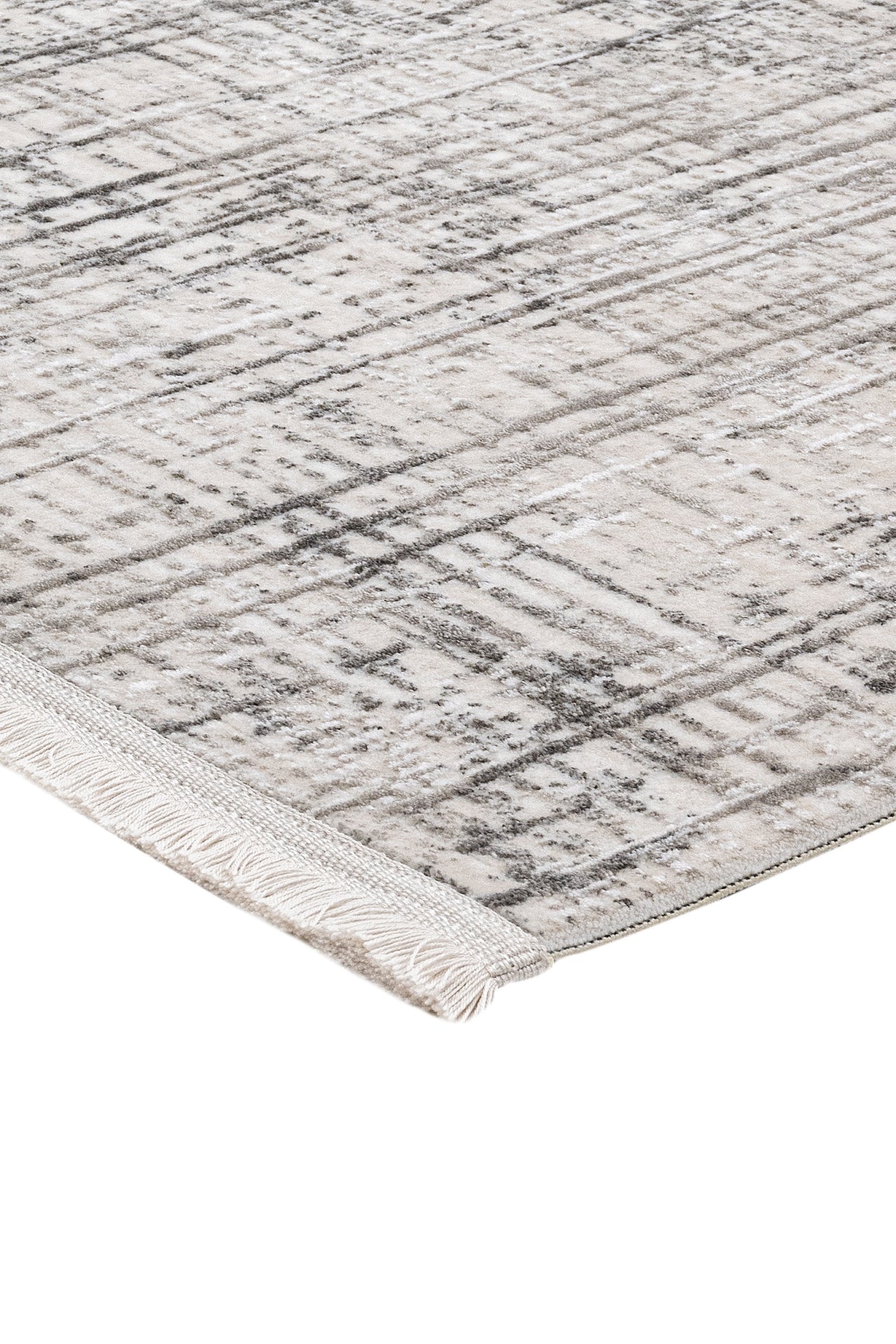 Grey Striped Area Rug - Machine Made Rug With 11 mm Pile Height & Laser Cut Fringe