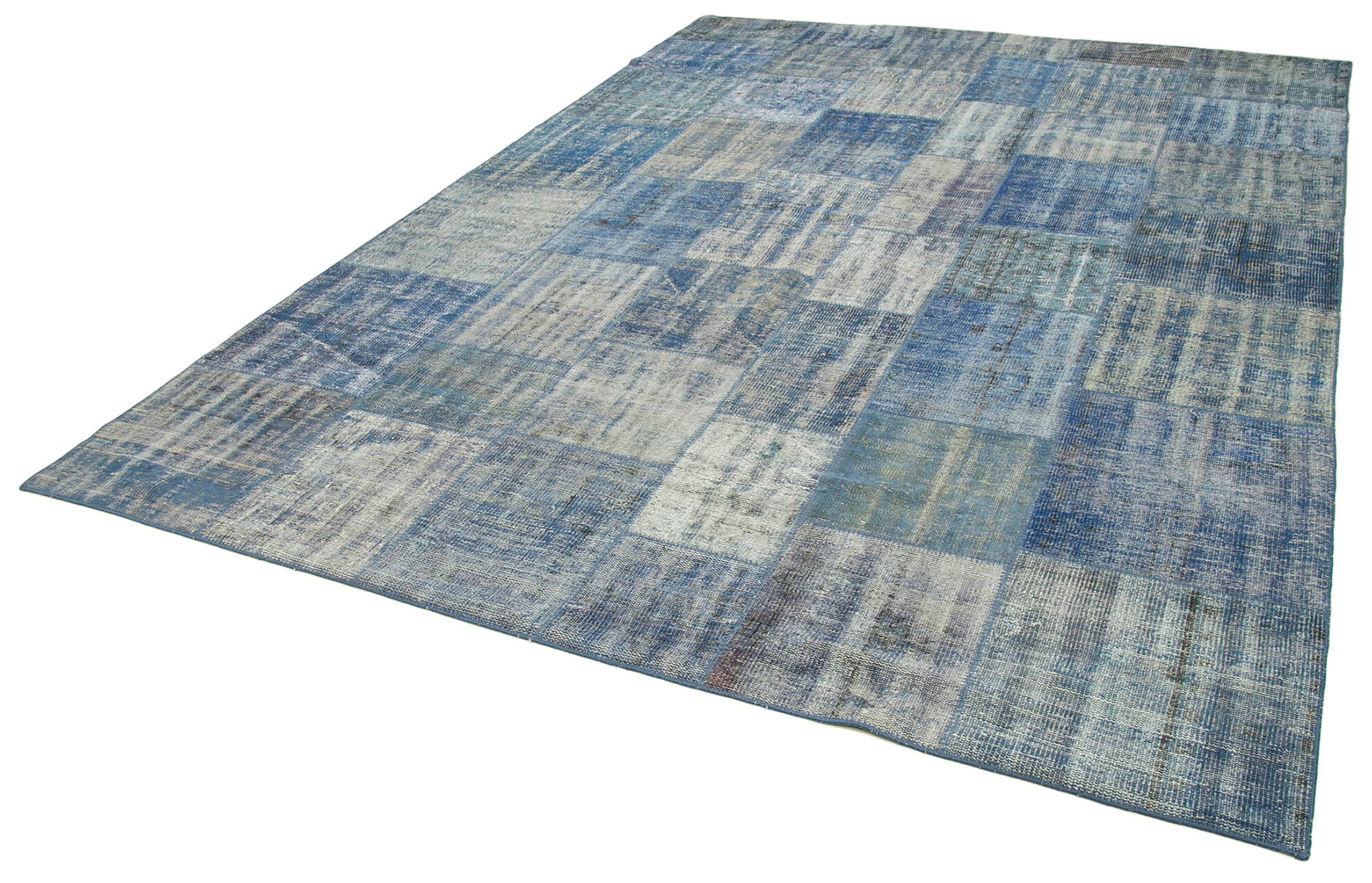 This handmade area rug is a stunning blue patchwork cotton wool carpet crafted in a vintage Turkish style, measuring 8'2" x 11'4". Designed as a hand woven rug, it brings warmth and character to any living room rug setting while offering the durability of natural fiber rugs. The traditional hand knotted techniques ensure each handcrafted floor covering is unique and built to last. Made from a soft wool carpet blended with cotton, this vintage Turkish carpet delivers both comfort and durability for everyday use.