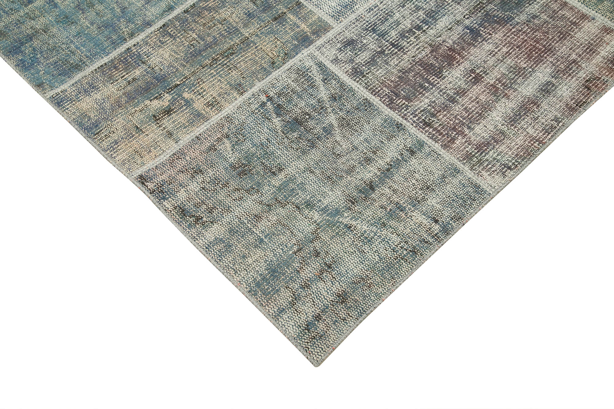 This handmade area rug is a stunning blue patchwork wool cotton carpet measuring 8'3''x11'8'', perfect for enhancing your living room with a blend of vintage charm and modern durability. Crafted as a hand woven rug from natural fibers, this traditional hand knotted Turkish vintage carpet combines soft wool floor covering with a durable cotton weave to provide both comfort and long-lasting quality. Each piece is carefully selected, cleaned, and treated using special washing techniques to neutralize and subtly alter the original color shades, resulting in a unique patchwork style carpet that adds character and warmth to any space.