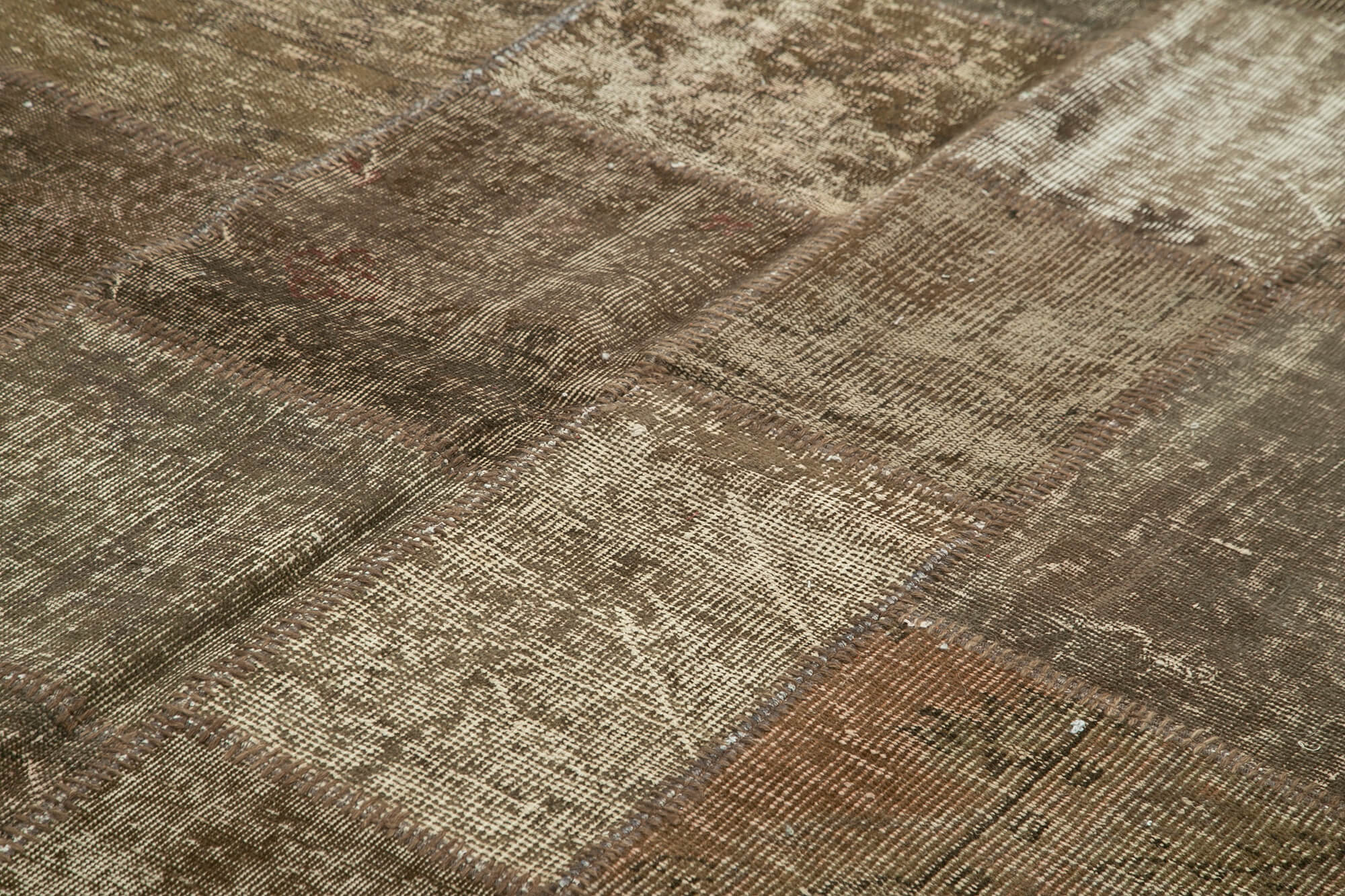 The cotton wool carpet combines the strength of cotton weave with the softness of wool fibers, providing a durable yet cozy surface perfect for high-traffic areas. This brown patchwork rug is produced using special washing techniques that neutralize original colors while preserving the authentic vintage look. The result is a timeless piece that maintains its beauty and resilience over decades.