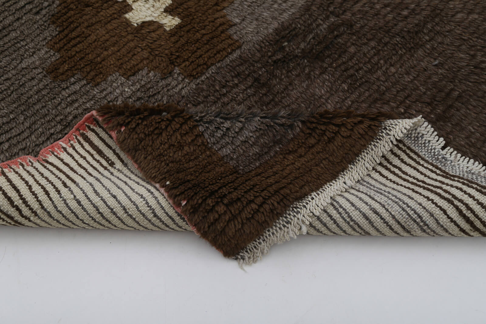 This handmade area rug is a stunning brown geometric cotton wool Turkish vintage carpet measuring 3'6''x5'1''. Crafted as a traditional hand knotted masterpiece, this hand woven rug combines natural fiber materials—cotton and wool—to offer durability and timeless style. The low pile area rug is perfect for adding warmth and character to any living space while supporting a bohemian style decor. Each vintage wool carpet is carefully selected, cleaned, and treated using special washing techniques that neutralize and subtly transform the original colors, ensuring a unique artisan crafted carpet with authentic charm.