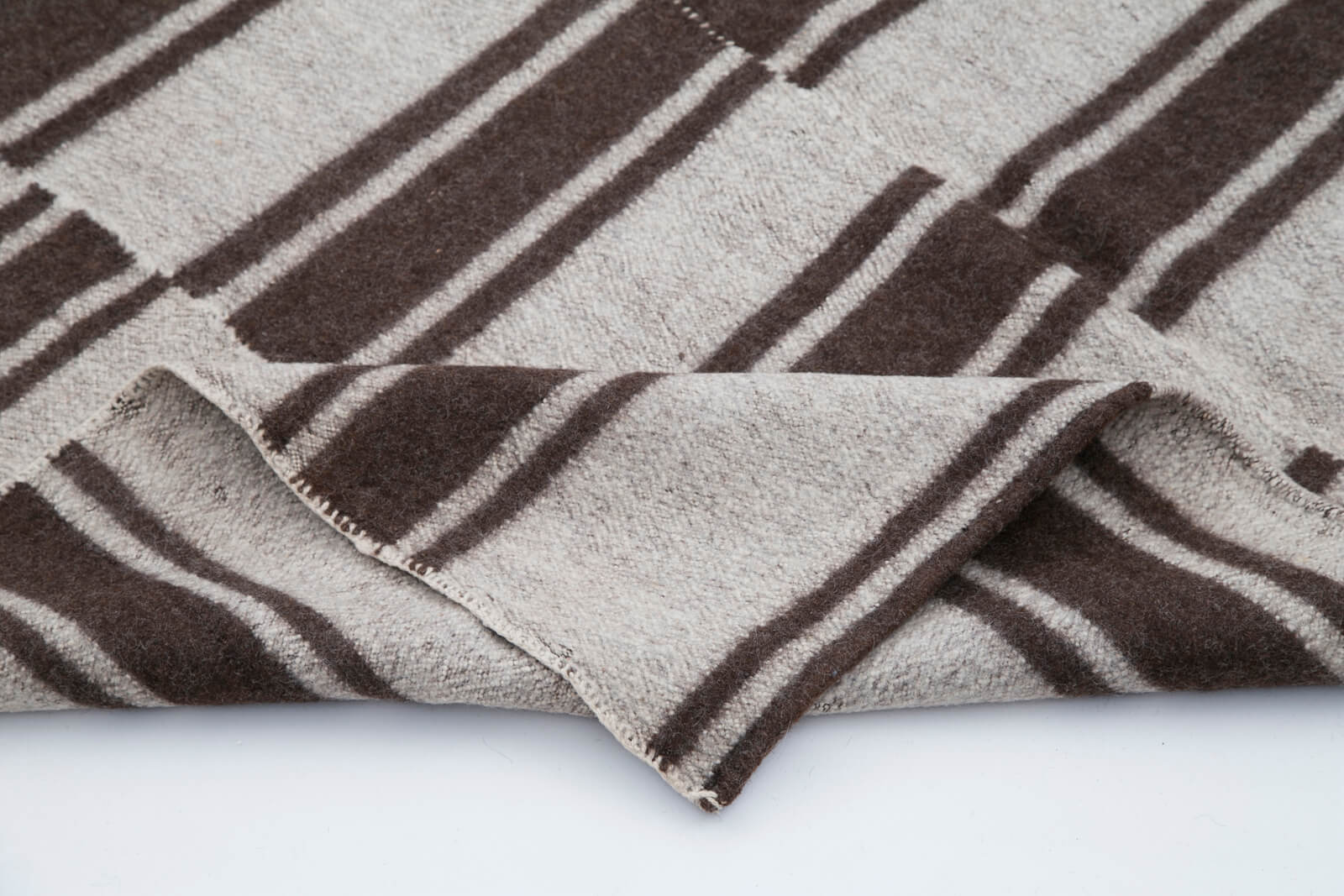 This handmade area rug is a stunning brown geometric Turkish wool rug measuring 4'10''x8'7'', expertly crafted using cotton and wool fibers to create a durable floor covering that enhances any living space. Designed as a traditional woven carpet, this artisan crafted rug combines vintage handwoven carpet techniques with modern durability, offering both style and long-lasting comfort. The soft wool carpet provides warmth underfoot, while the natural fiber rug construction ensures breathability and resilience. Each hand knotted rug is carefully selected from 30 to 70 years old vintage carpets, cleaned, washed, and treated with special techniques to neutralize and subtly alter the original colors, resulting in a unique brown patterned rug perfect for bohemian style interiors or classic decor.