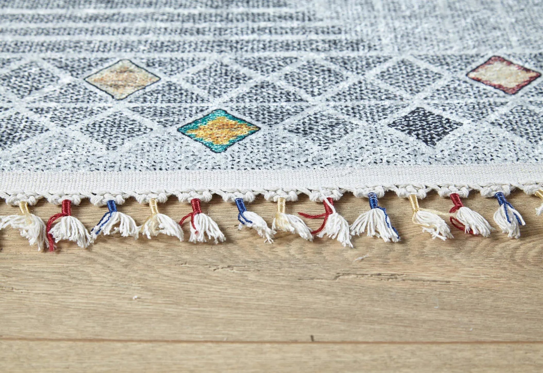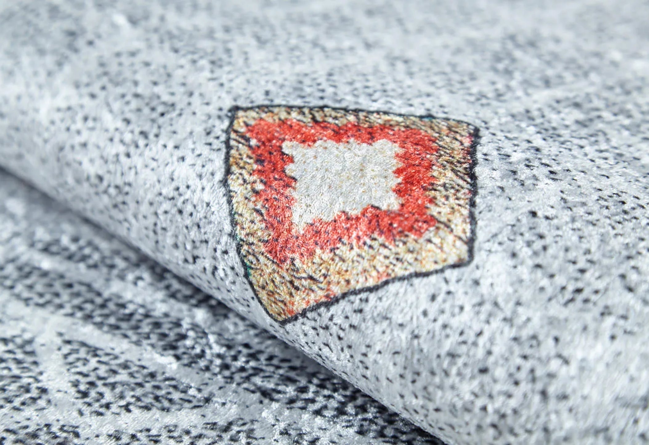 - Grey geometric area rug with eye-catching digital print rug design → elevates room style instantly