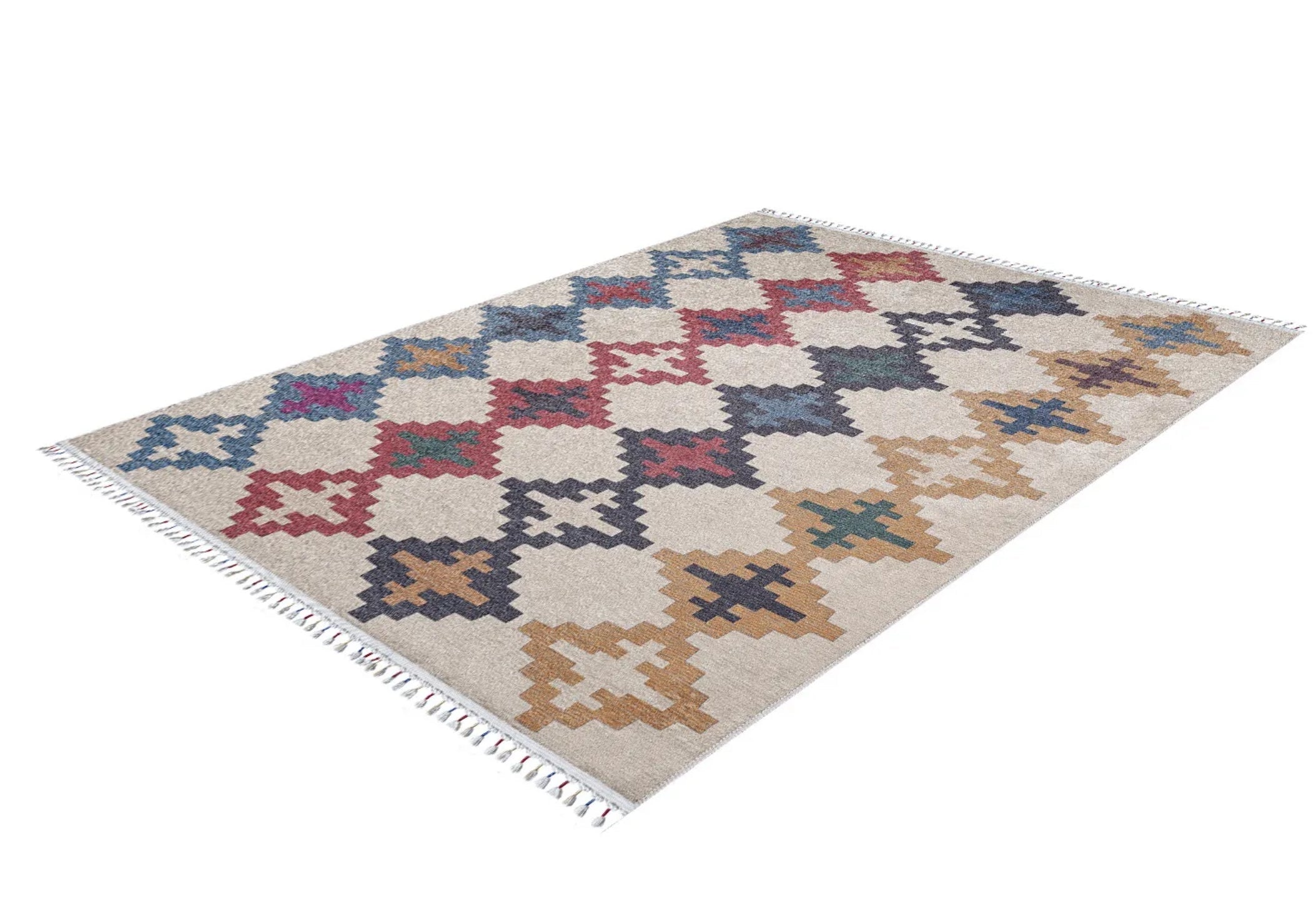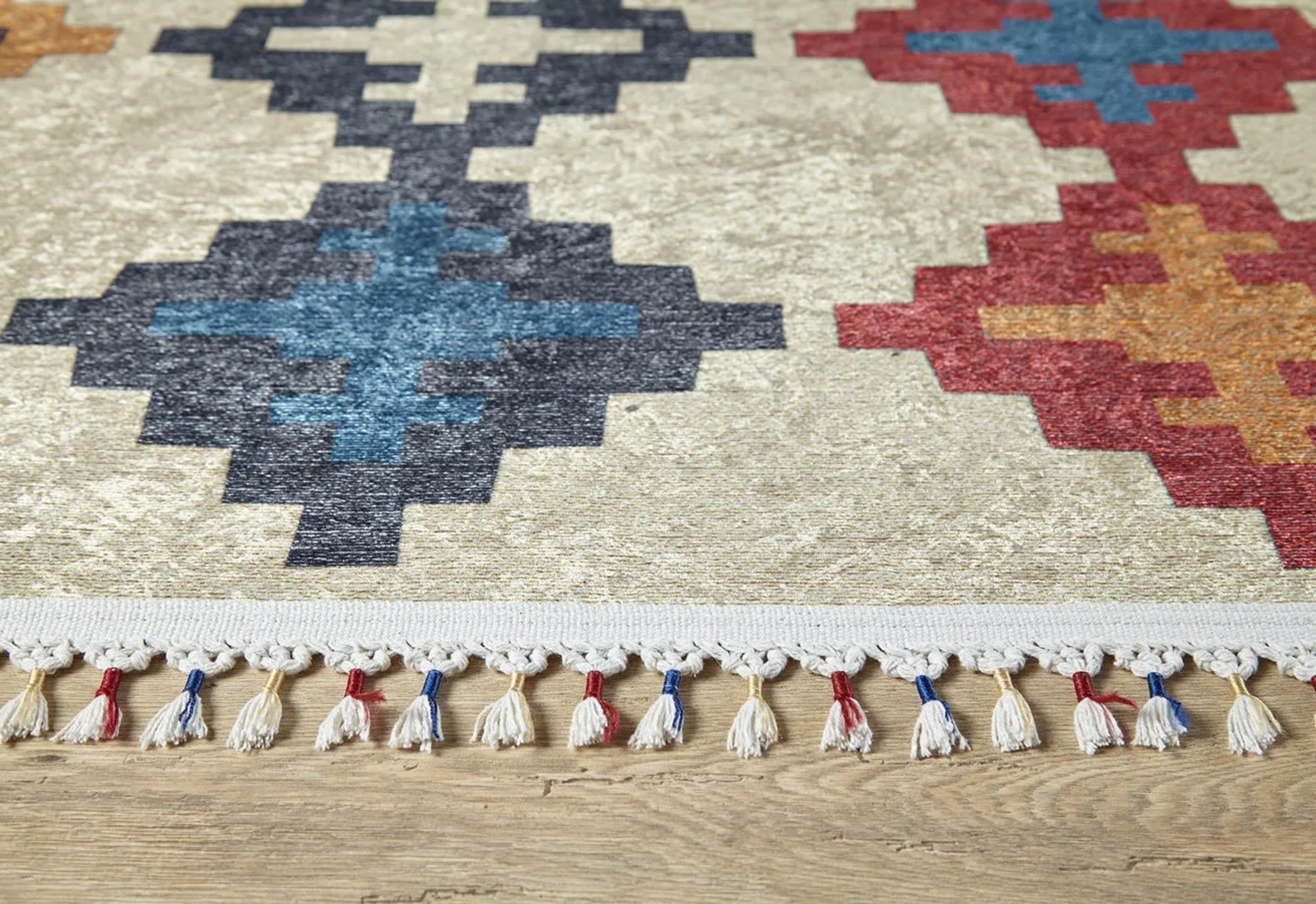 The geometric area rug from Halınet is a digital print carpet designed to enhance your living space with modern style and practical benefits. This colorful area rug features a non slip rug backing to keep it securely in place, making it ideal for high-traffic areas like your living room or hallway carpet. Crafted as an antibacterial carpet, it helps reduce allergens and is allergy friendly, ensuring a healthier home environment. The washable floor mat design allows for easy cleaning and maintenance, preserving its vibrant pattern and quality over time.