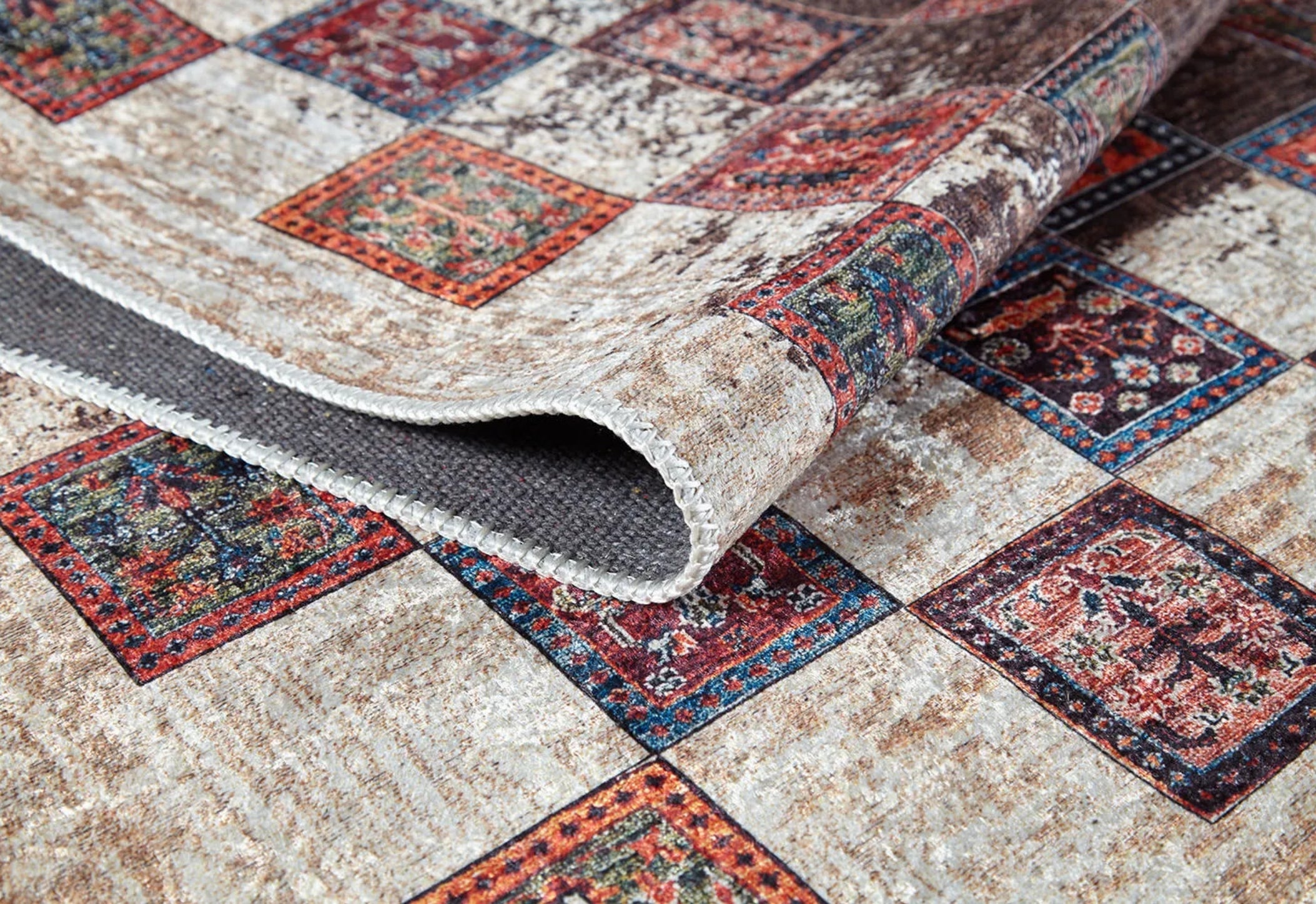 The brown geometric area rug from Halınet is a stylish home carpet designed to transform your living room with its modern geometric design and superior functionality. This washable area rug combines digital printing technology with practical features to offer a floor mat that is both beautiful and durable. Crafted as a non slip rug, it ensures safety on smooth surfaces while providing an antibacterial rug surface that helps maintain a clean and healthy environment. Its antiallergic carpet properties make it ideal for households sensitive to dust and allergens, making it perfect not only for your living room but also as a hallway floor covering.