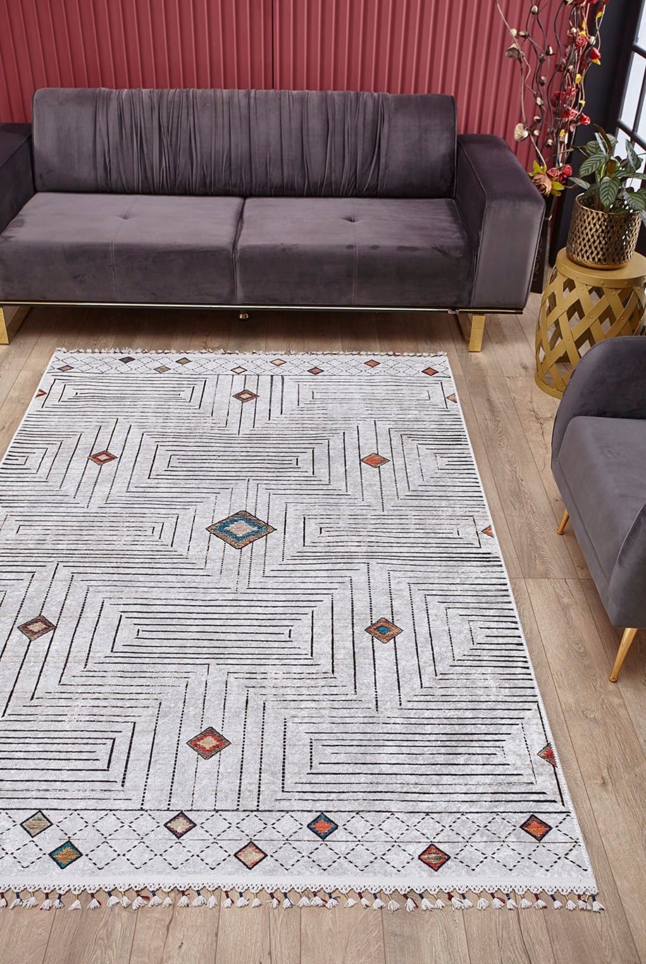 This area floor covering measures precisely to fit standard living room spaces, providing both comfort and durability. The digital design carpet features high-resolution printing technology that preserves vibrant colors and sharp geometric shapes, maintaining its modern aesthetic over time. Tested for quality and safety, this antibacterial carpet comes with a one-year warranty from Halınet, assuring you of its reliability.
