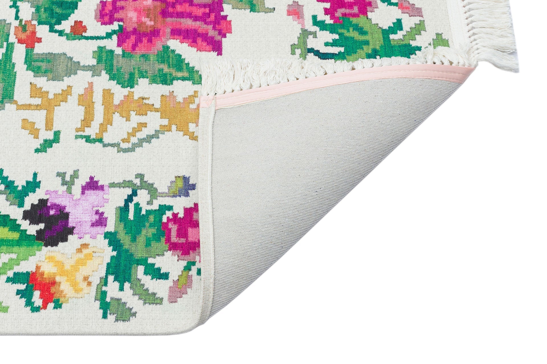 Tested for long-lasting performance, this white floral kilim rug maintains its softness and color vibrancy after repeated washes. It is produced and packaged by expert teams ensuring the product you receive matches the images exactly. This combination of quality materials and thoughtful design makes it a reliable choice for anyone seeking both beauty and practicality in their home textiles.