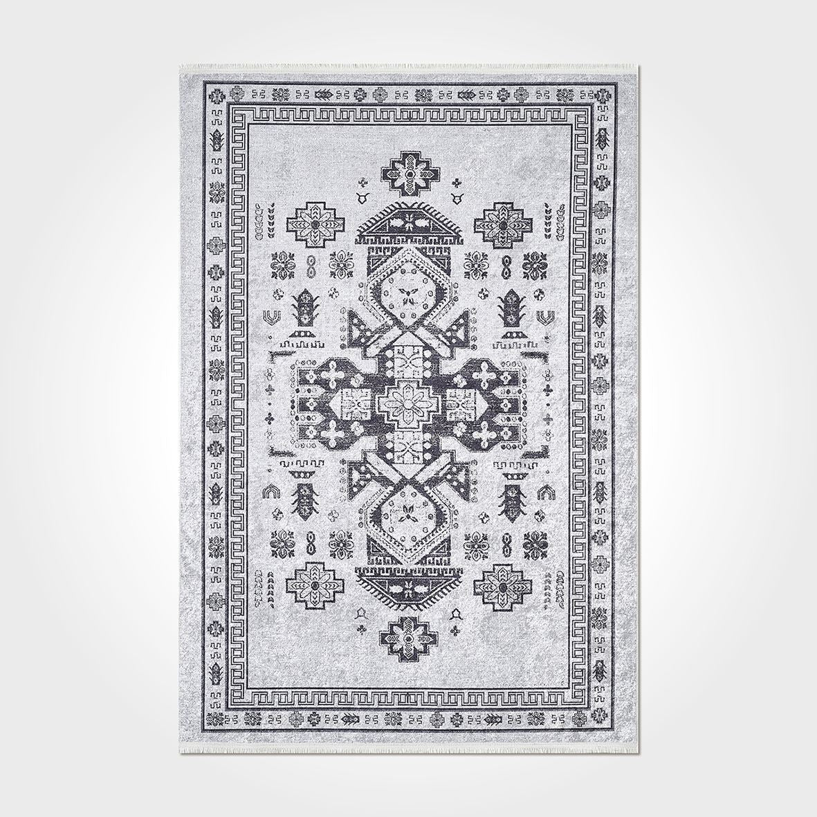 Grey Chenille Area Rug – Washable Non Slip Cotton Polyester Carpet with Modern Frame Design