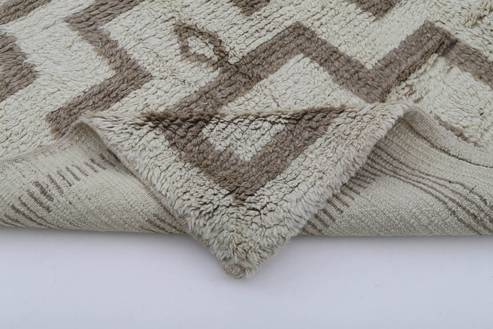 This neutral beige carpet features a boho geometric rug design that complements various interior styles, from modern to rustic. The natural fiber rug is carefully cleaned and treated to preserve its original colors while offering a refreshed look through special washing techniques. Tested for durability and softness, this handcrafted area carpet provides a soft wool floor rug experience without sacrificing strength.