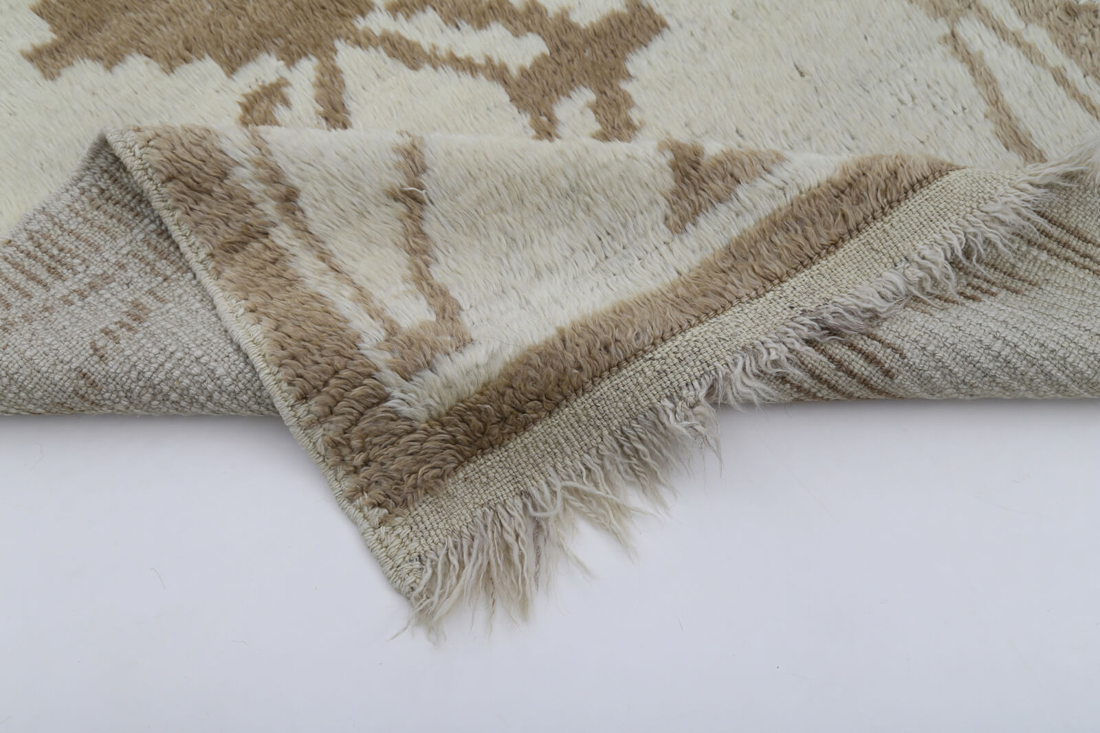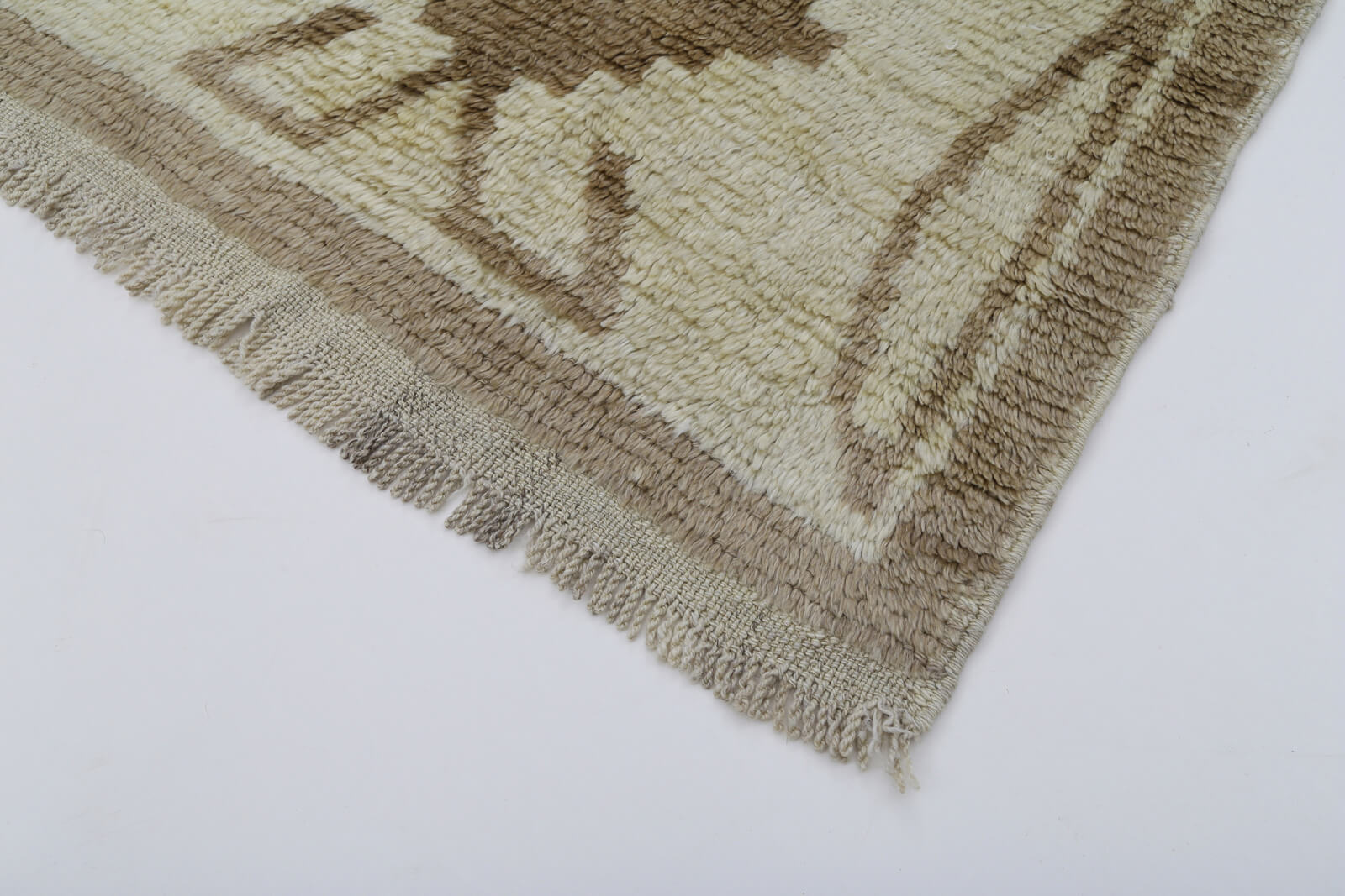 Each cotton wool rug is carefully selected from vintage carpets aged 30 to 70 years, then expertly cleaned and washed using special techniques that neutralize original colors while maintaining the decorative cotton rug's authentic look. This process preserves the unique character of every piece, making it a one-of-a-kind beige floor covering that complements both modern and classic interiors.