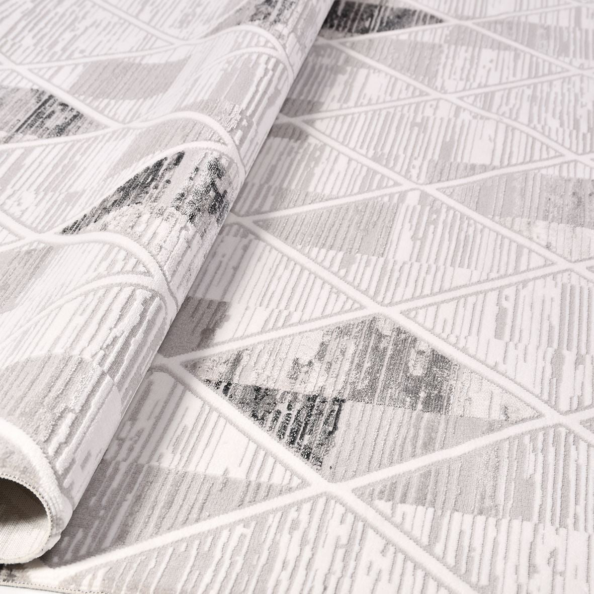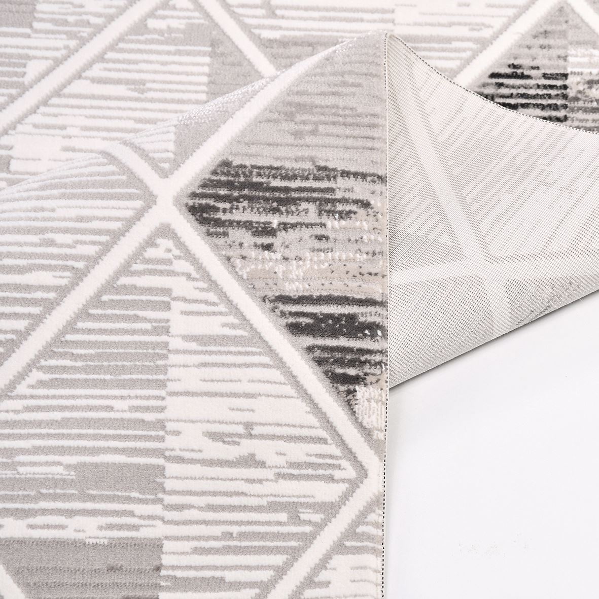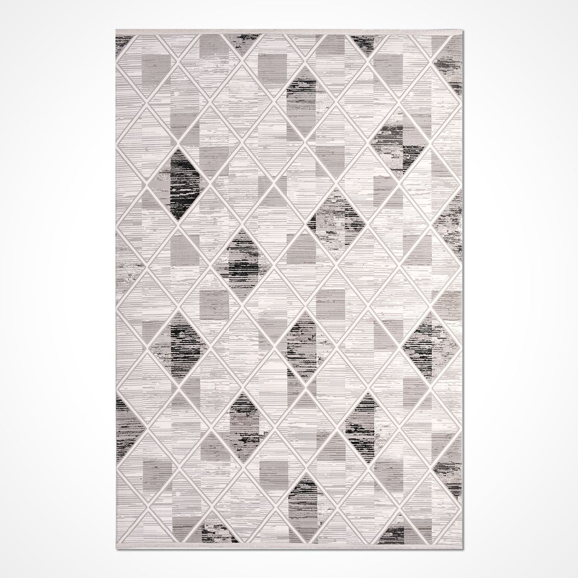 The Geometric Area Rug by Crea is a modern geometric rug designed to enhance your living room with style and durability. This machine made rug features a 600000 stitch density and an 8mm pile height, crafted from 100% polyester yarn for a soft yet resilient texture. The laser cut edge provides a clean finish that prevents fraying, making this grey area rug a long-lasting addition to your home decor. Tested for quality and backed by Crea rugs' trusted craftsmanship, this contemporary carpet combines aesthetic appeal with practical use.