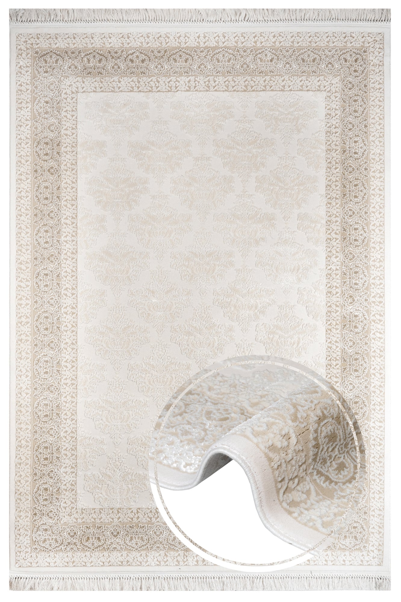 Beige Geometric Area Rug - Machine Made Acrylic Carpet with Fringed Edges