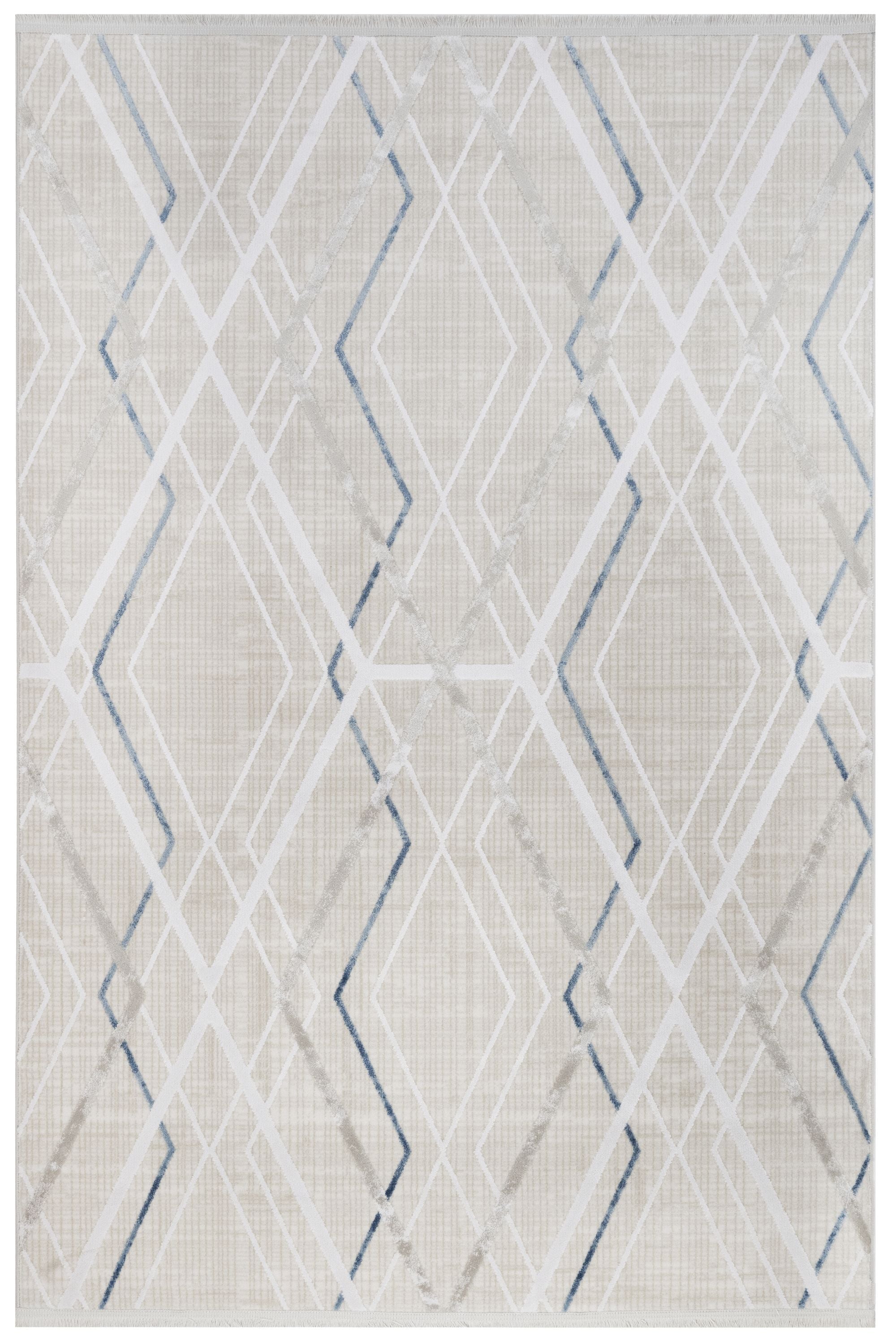 Blue Geometric Area Rug – Machine Made Carpet With Fringed Edges For Modern Living Room