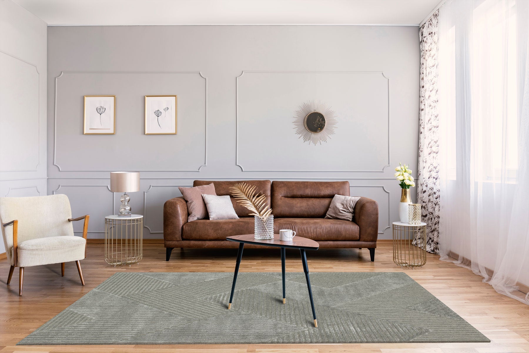 - Geometric patterned carpet → modern aesthetic enhancing any decor