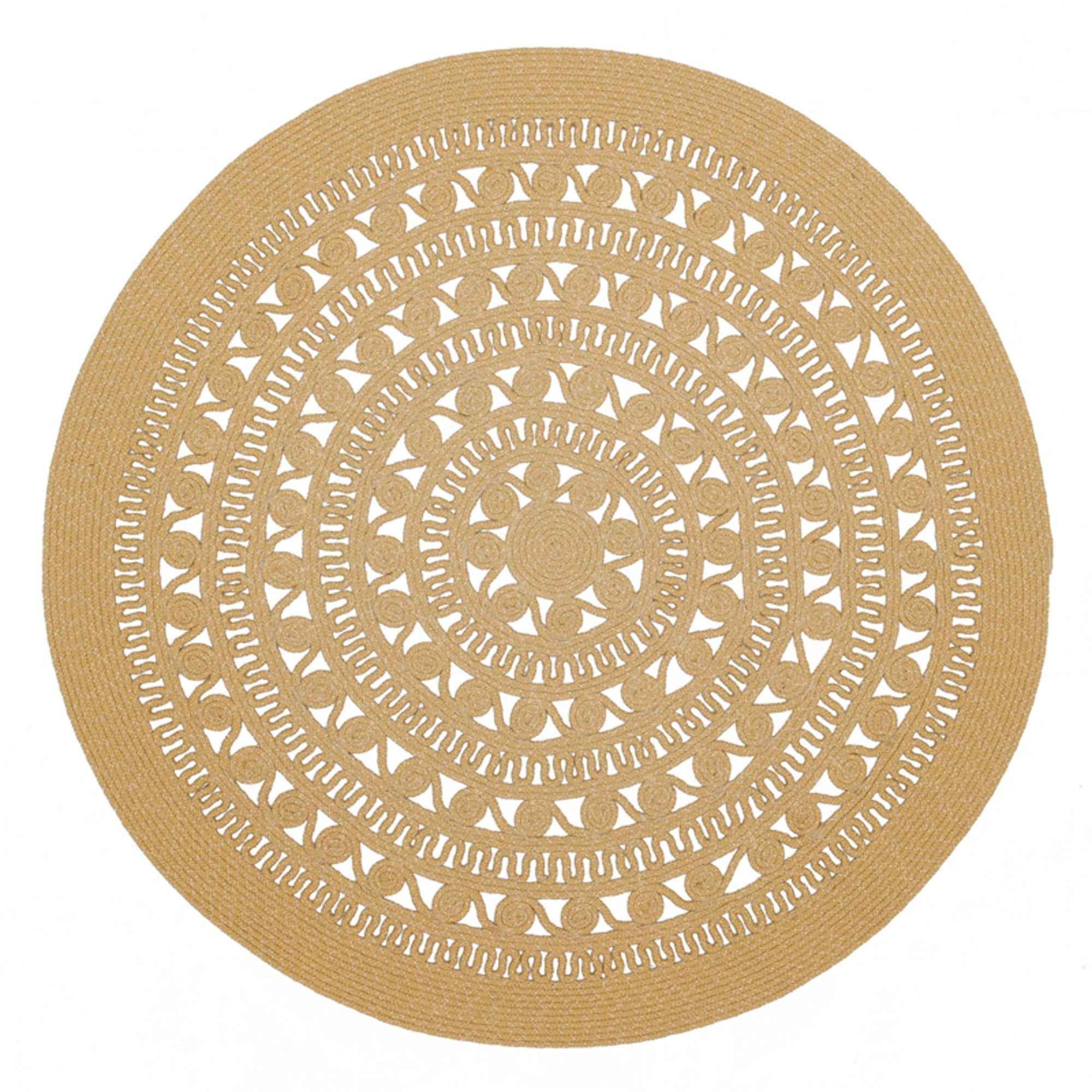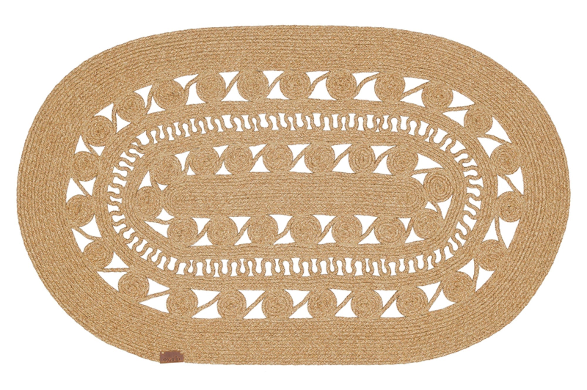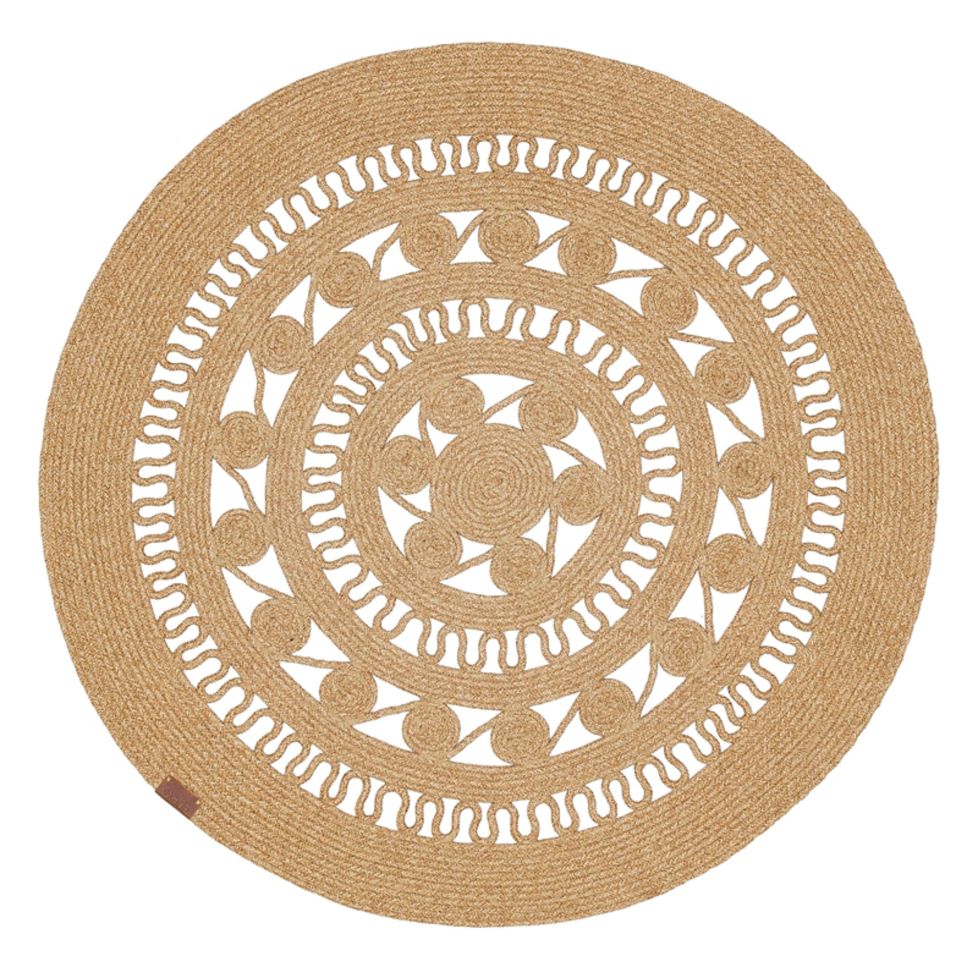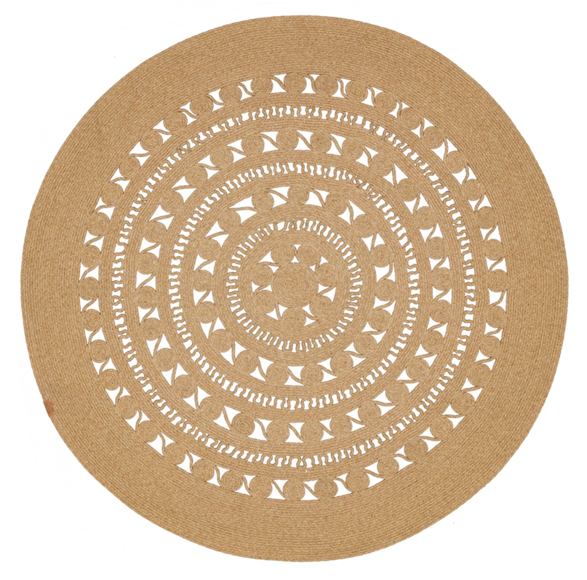 - Beige jute carpet with geometric pattern → complements various interior styles