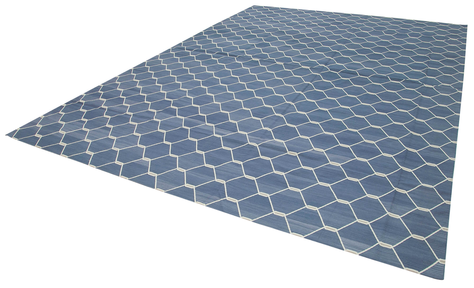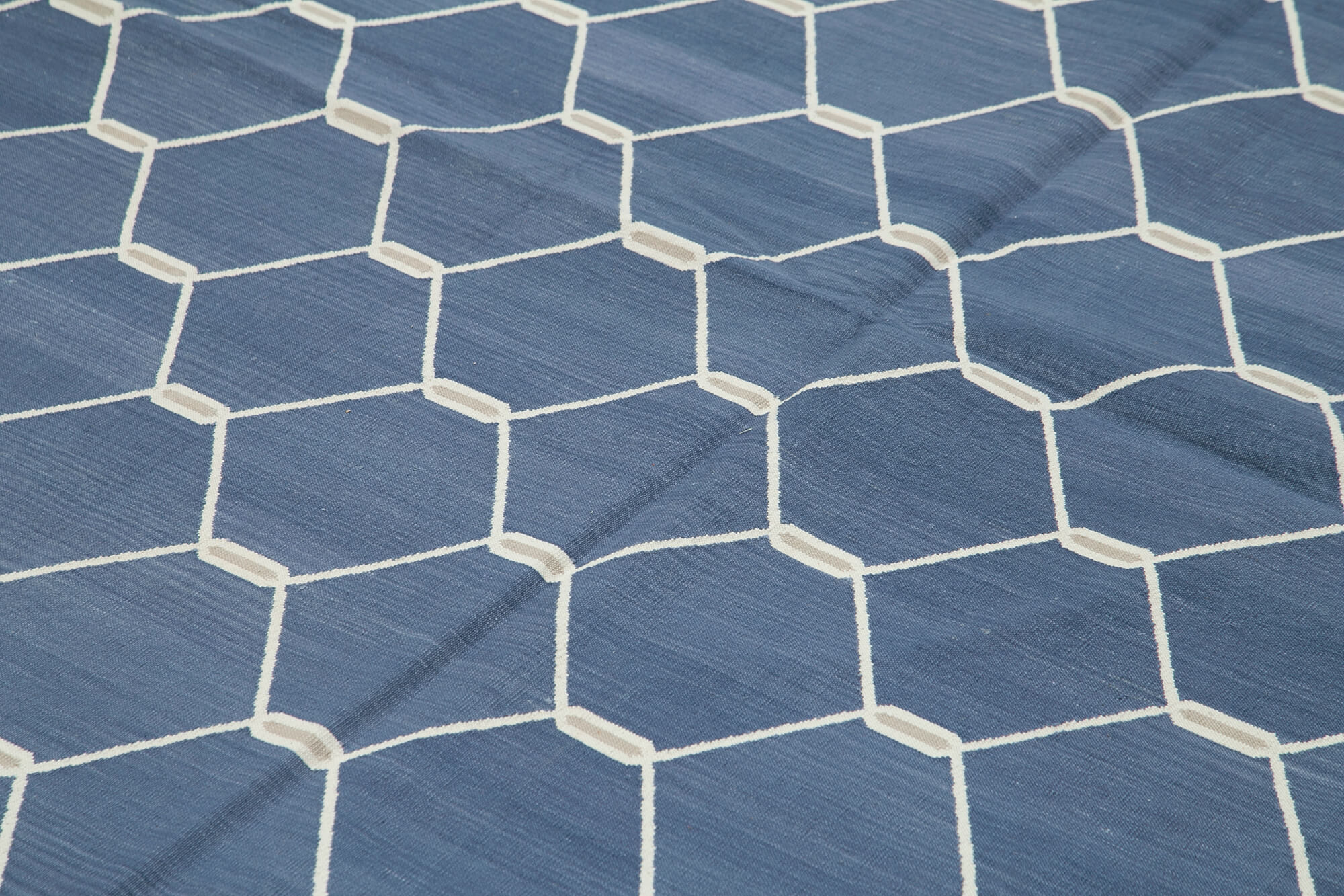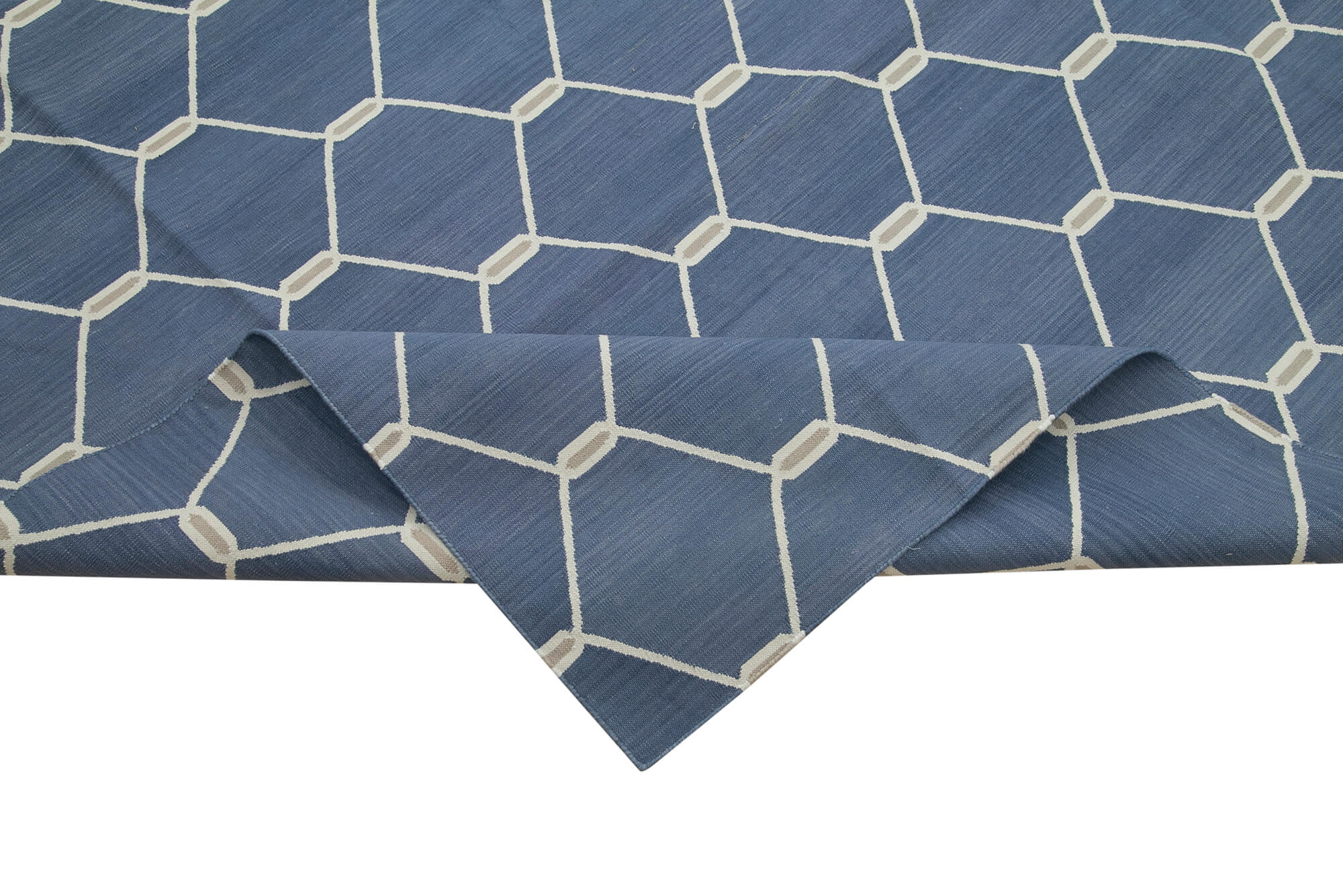 Handmade Area Rug - Blue Geometric Cotton Wool Turkish Handwoven Carpet 9'11" x 13'11"