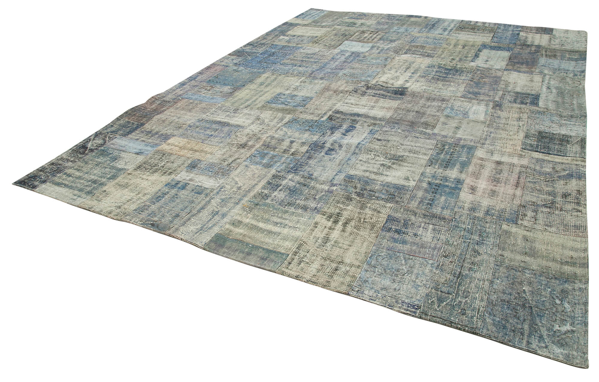 This handmade area rug from Agacan combines traditional craftsmanship with durable materials to create a stunning blue patchwork cotton wool rug perfect for large living room spaces. Measuring 9'11''x13'6'', this natural fiber area rug features a soft texture floor covering that enhances comfort while adding timeless style. The vintage handwoven carpet is crafted from high-quality wool and cotton, offering a durable wool carpet that withstands daily wear while maintaining its plush feel. Each Turkish hand knotted rug is carefully cleaned and treated using special washing techniques to neutralize and subtly alter the original colors, preserving its oriental style carpet charm.