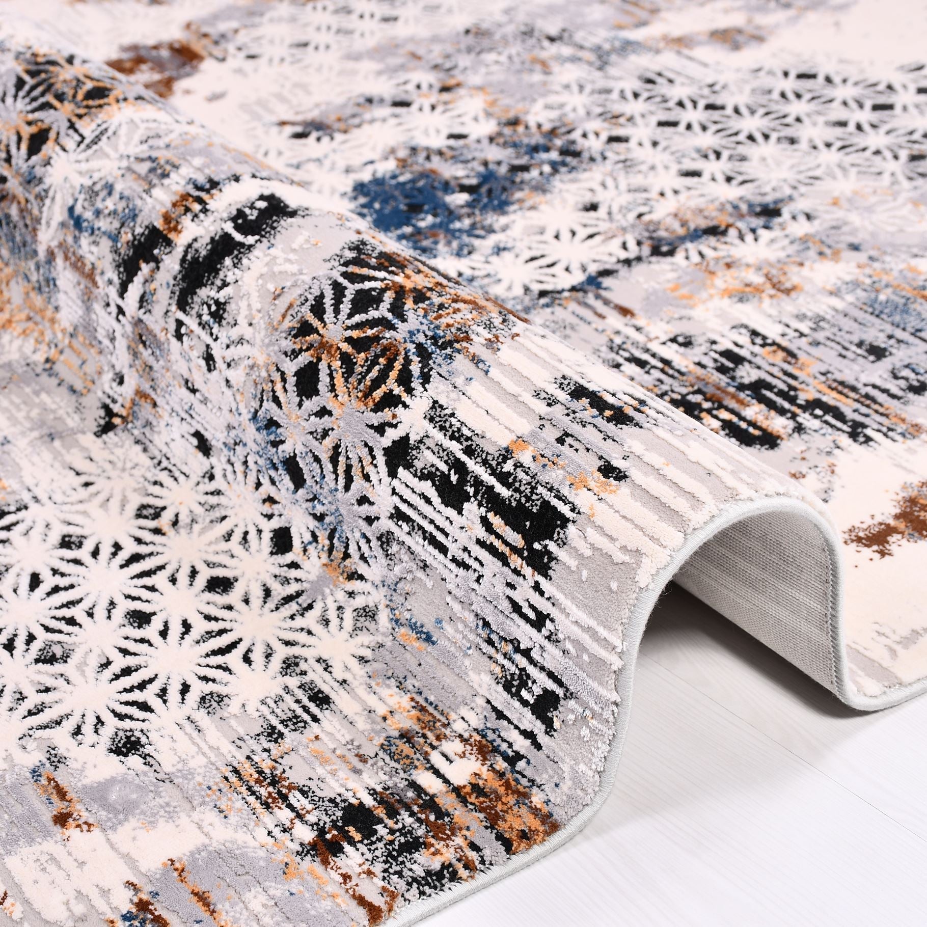 The Modern Viscose Area Rug is a machine made rug designed to enhance any space with style and comfort. This grey area rug features a soft viscose carpet surface made from durable acrylic yarn, providing a luxurious feel underfoot while maintaining long-lasting quality. Crafted with a cotton weft, the rug boasts a low pile height carpet of 0.8 mm and an impressive loop density of 1,230,000, ensuring resilience and a refined texture. Its overlocked edge rug finish prevents fraying and adds durability, making it ideal for high-traffic areas in your modern living room or any contemporary floor covering need. The non slip floor mat backing keeps the rug securely in place for safety and convenience. Tested for durability and easy clean maintenance, this modern style carpet is perfect for those seeking both elegance and practicality.