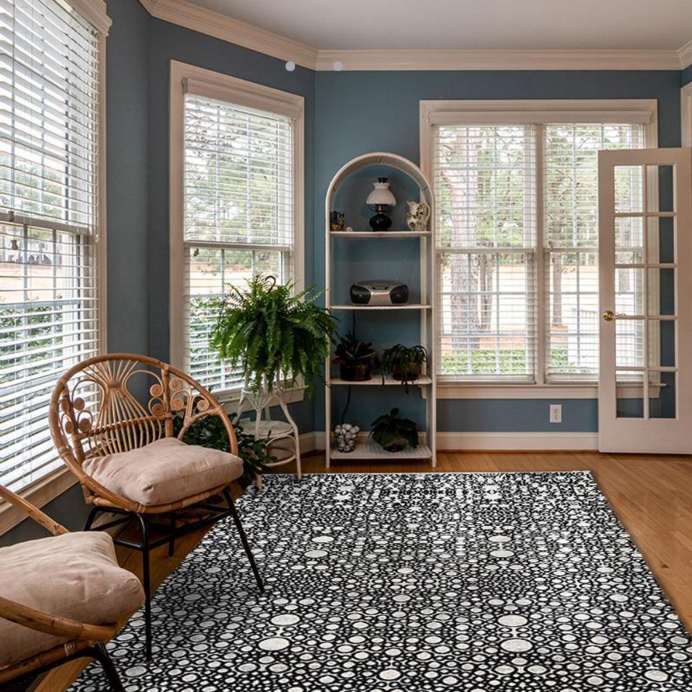- Black geometric area rug design that complements modern interiors