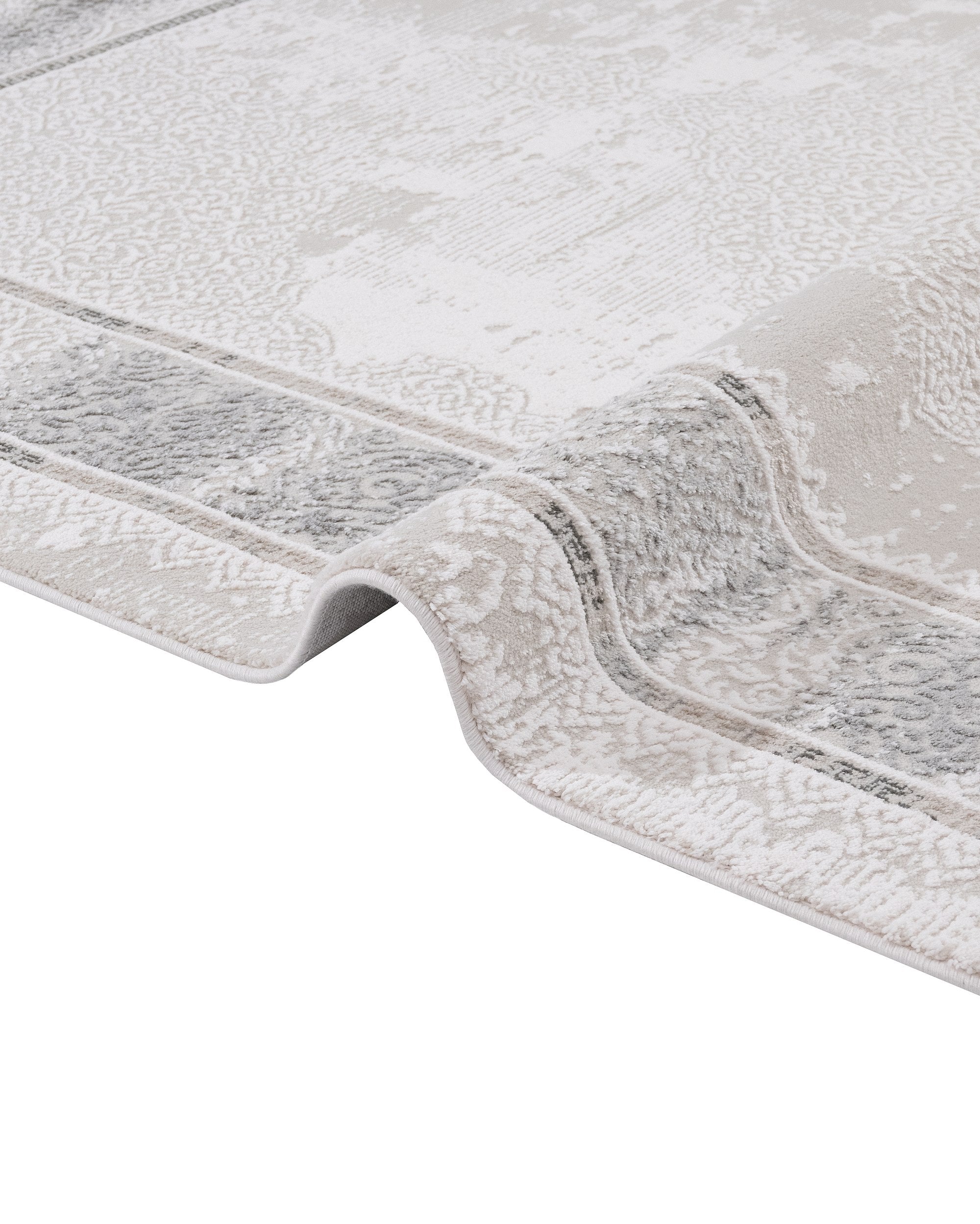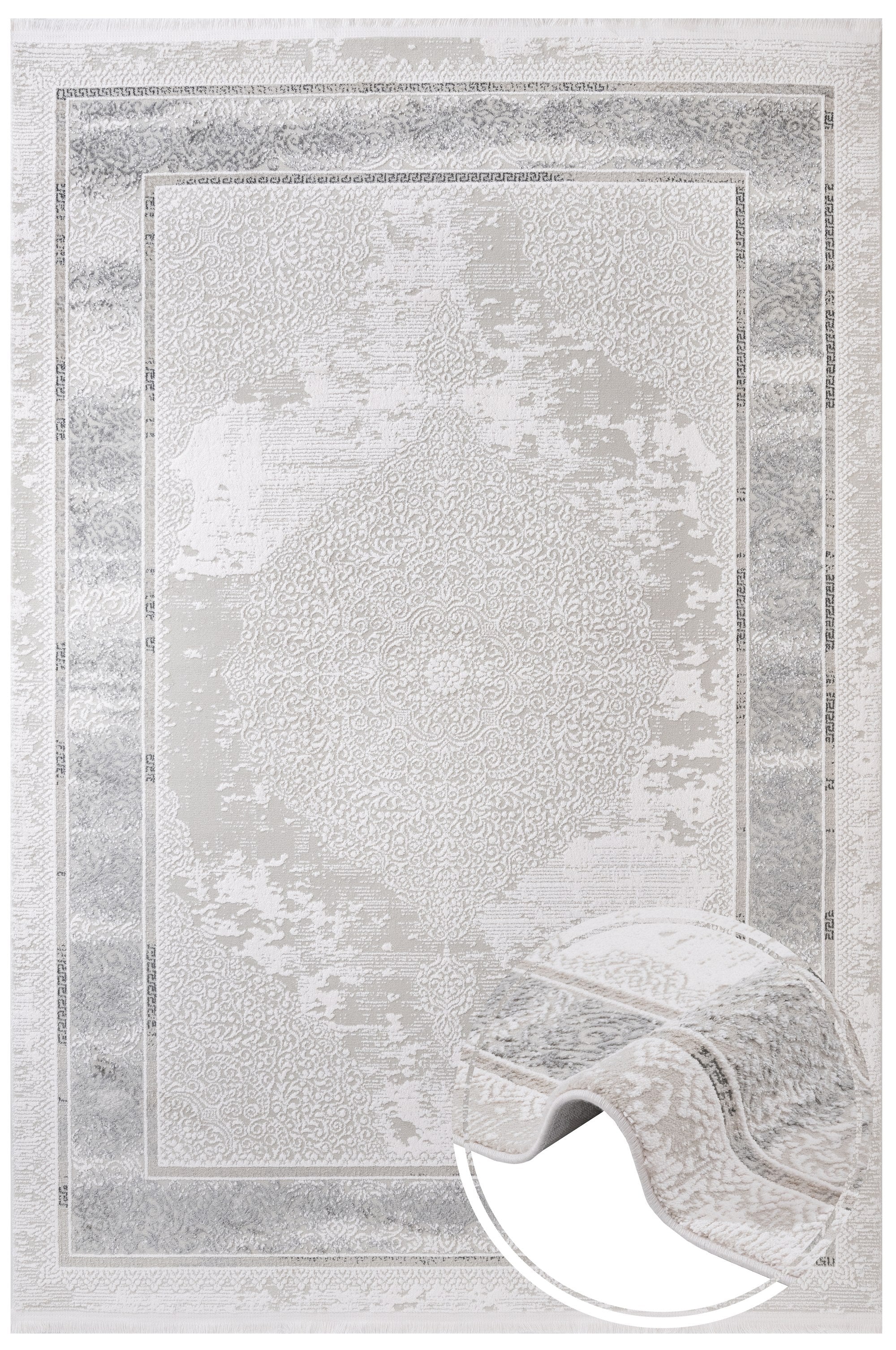 Ideal as a living room rug, this framed design carpet combines practicality and style. The soft cotton threads create a warm atmosphere while the grey frame offers a subtle yet sophisticated accent. Whether placed under a coffee table or near seating areas, this machine made cotton area rug enhances comfort while protecting your floors.