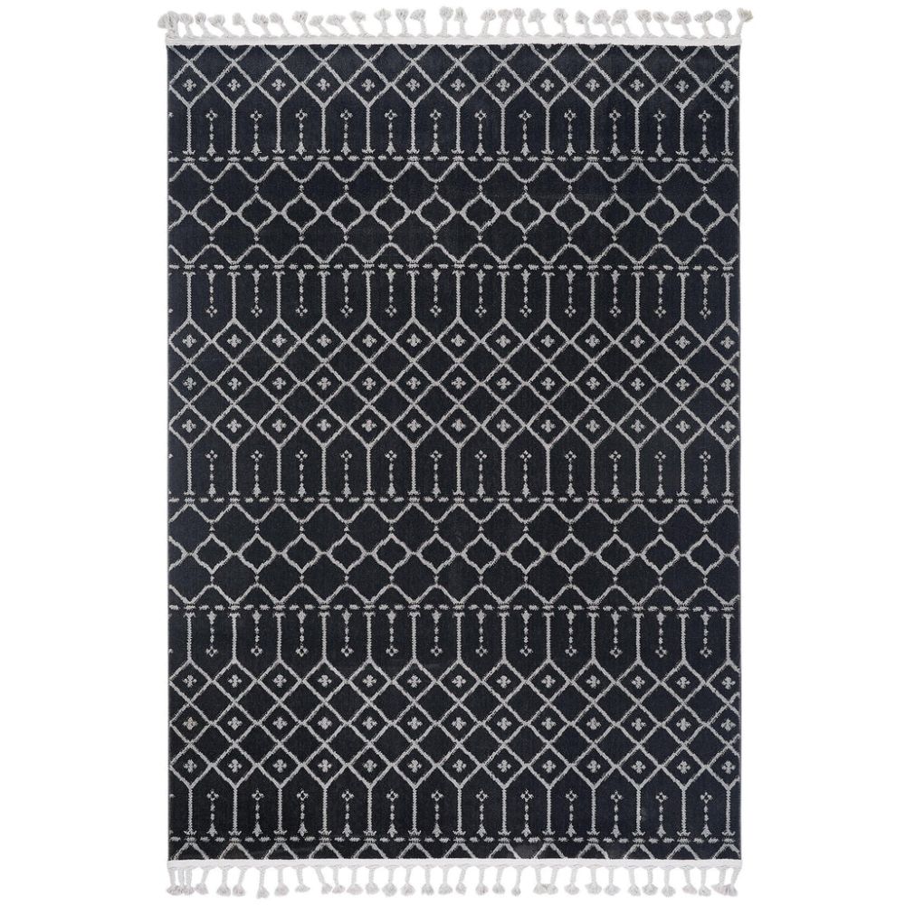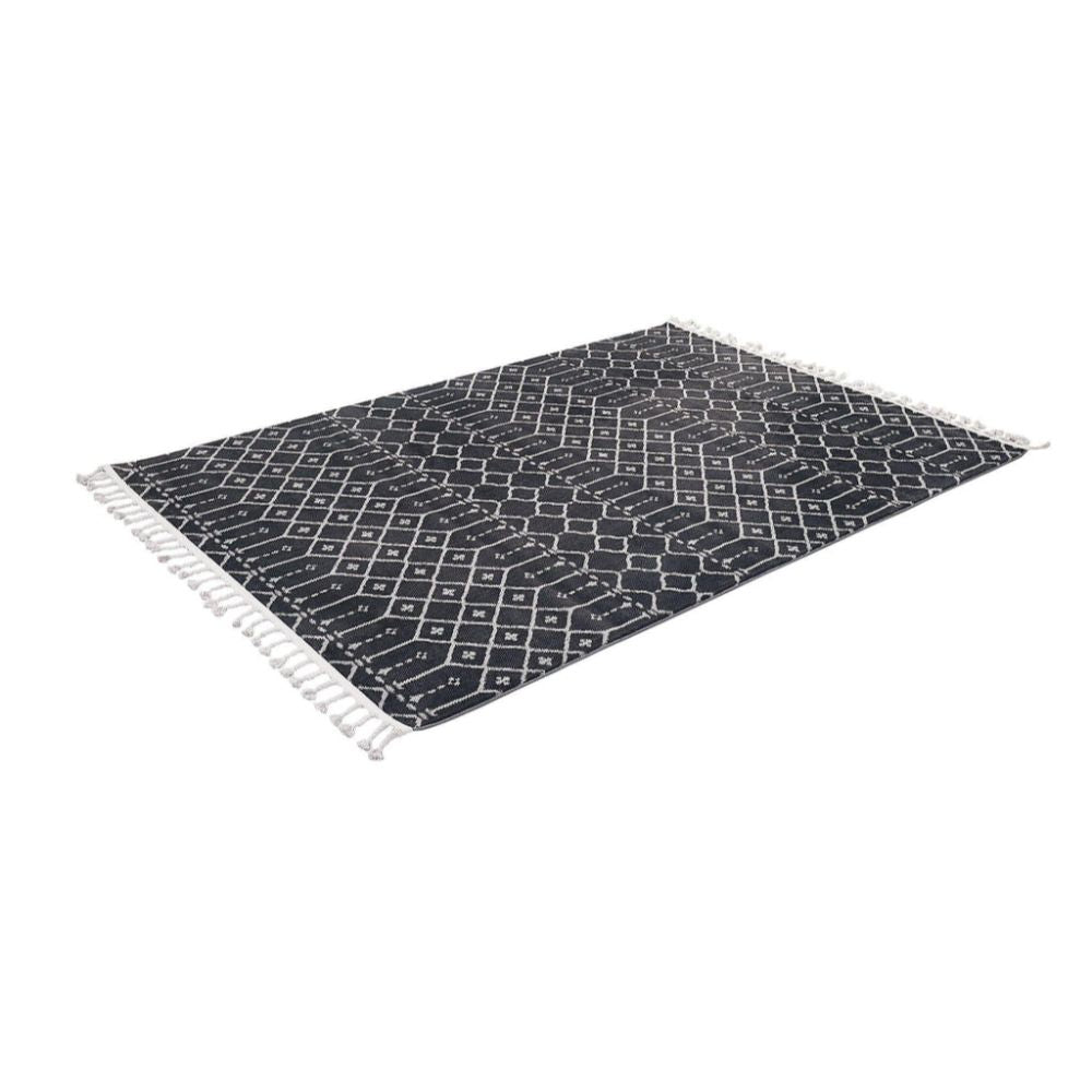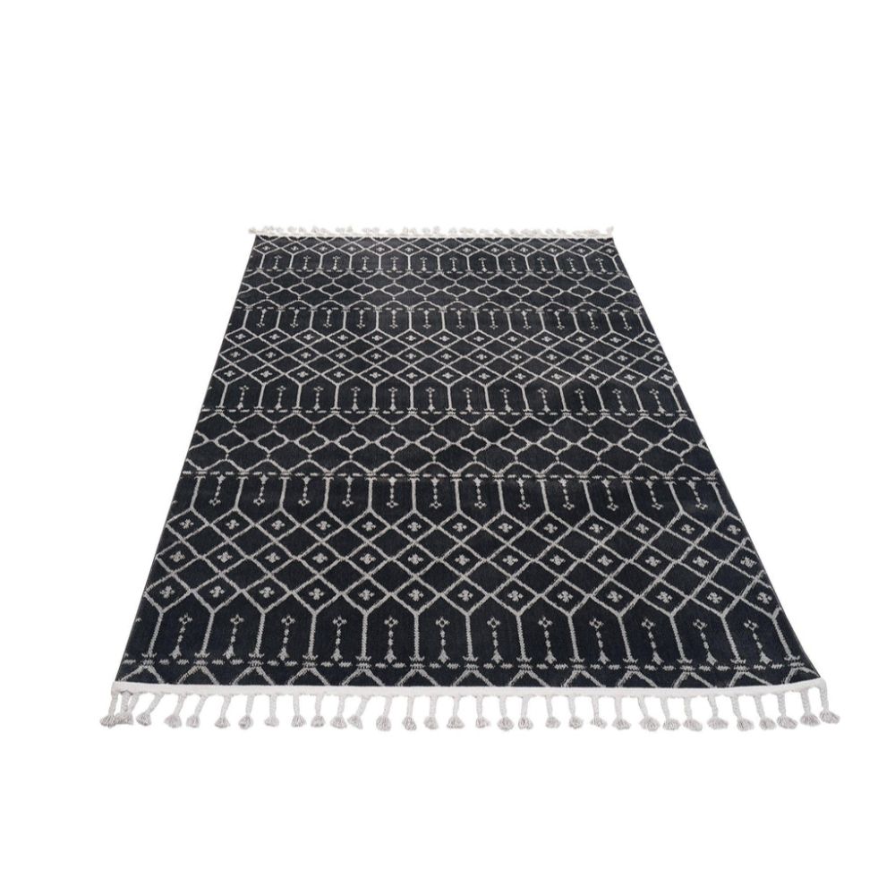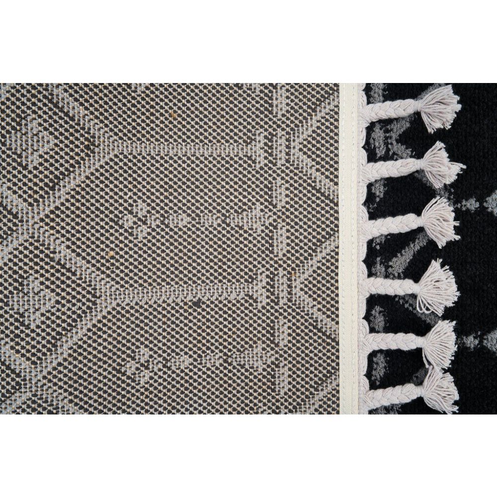 The black geometric area rug is a machine made microfiber carpet designed to enhance any living room or hallway with modern style and lasting comfort. Featuring a 9 mm pile height, this soft texture carpet delivers plush underfoot feel while maintaining durability. Its lint proof rug and dust resistant rug qualities ensure low maintenance and lasting cleanliness, making it ideal for busy households. Crafted by Dolce Vita, this flatweave floor covering combines contemporary design with practical features for everyday use.
