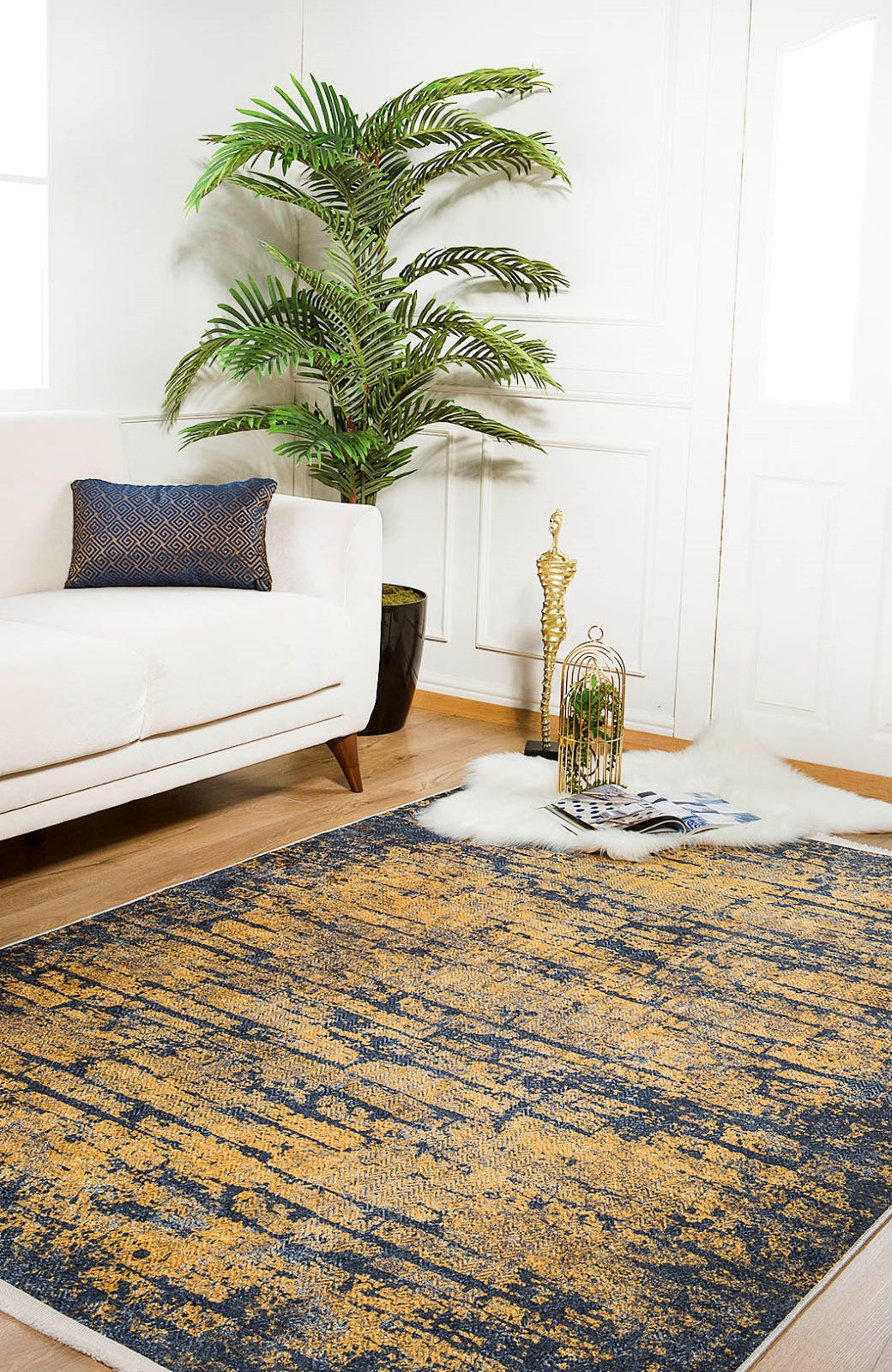 - Yellow area rug in a hardal colored rug shade that complements modern interiors