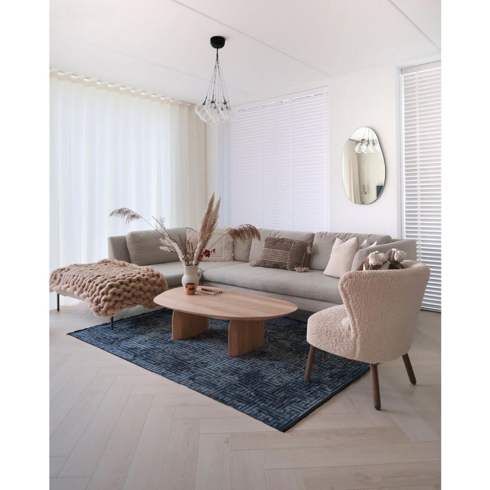 - Navy geometric rug pattern adds a contemporary touch to any room