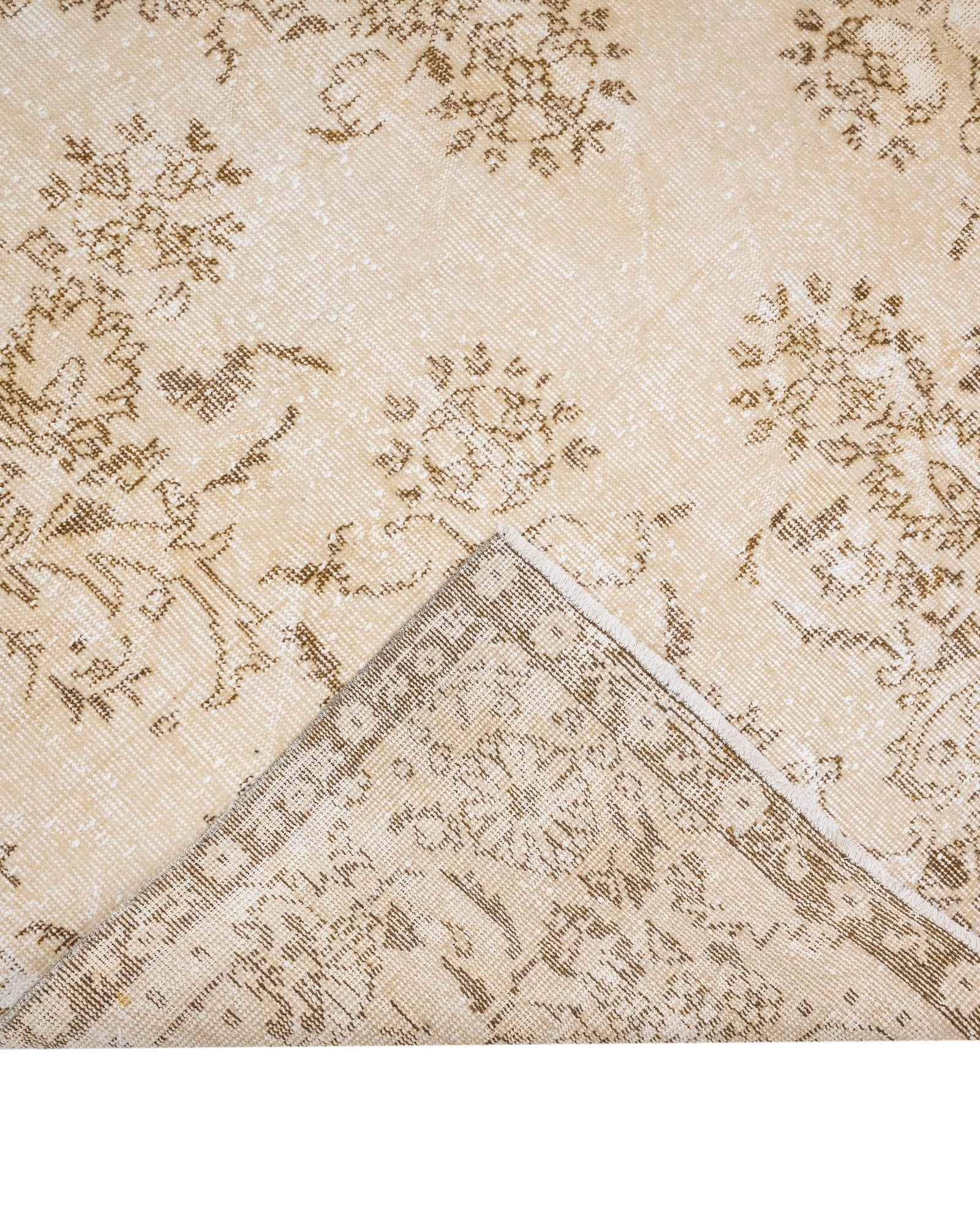 This handmade wool rug combines the best of vintage aesthetics with modern durability. The cotton wool blend ensures easy maintenance while keeping the fibers soft and inviting. Its substantial size covers ample floor area, making it suitable for living rooms, dining areas, or bedrooms. The detailed medallion pattern reflects authentic Anatolian artistry from the 60s and 70s, revitalized through expert weaving techniques.