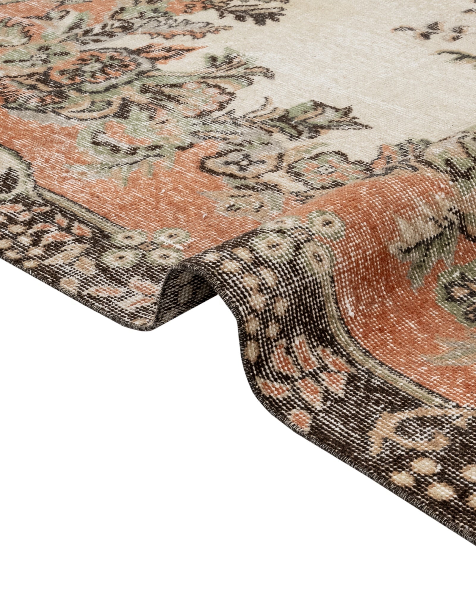 Each vintage wool carpet is carefully selected, cleaned, and washed to preserve its rich colors and intricate patterns. The cotton wool blend rug provides softness underfoot and resilience against everyday wear, making it an ideal handcrafted area rug for high-traffic rooms. Its classic medallion design adds a striking focal point that complements both traditional and contemporary decor.